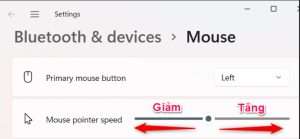 Trong win 11, kéo thanh trượt trong phần Mouse pointer speed sang trái để giảm, sang phải để tăng tốc độ.